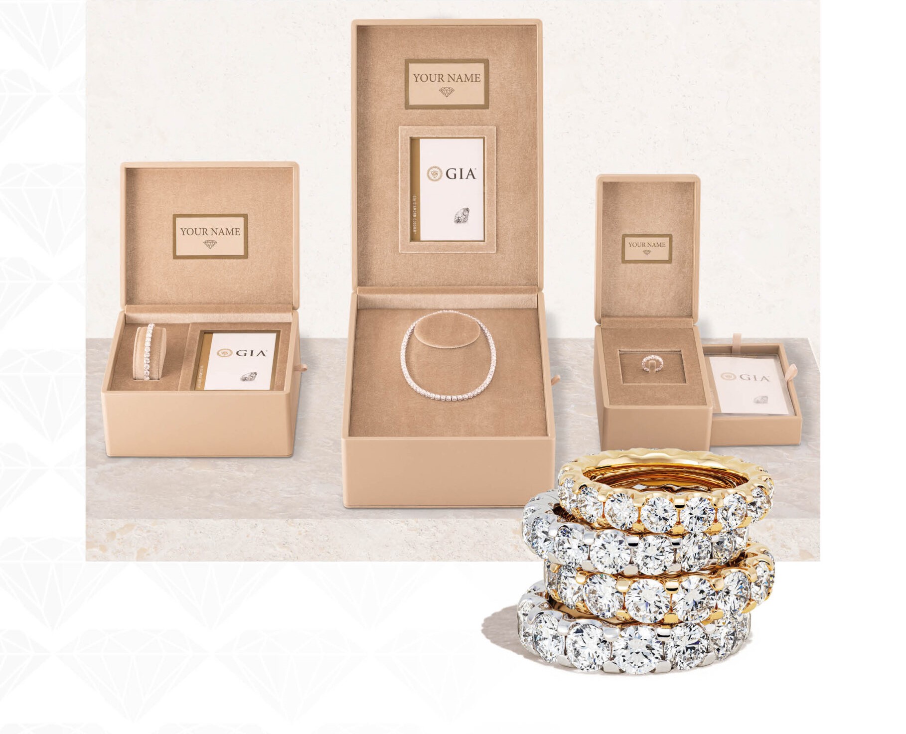 This collection includes solitaire pieces, anniversary rings, tennis bracelets, and necklaces with brilliant-cut diamonds starting from 0.20 ct, all GIA certified. Each item comes in a specially designed jewelry box with space to store its certificate safely.